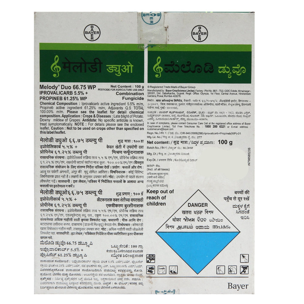 Melody Duo is a modern fungicide containing the two active ingredients Iprovalicarb and Propineb. It provides excellent control of a broad range of fungal species from Oomcytes class (e. g. Plasmospora viticola, Phytophthora spp., Pseudoperonospora spp., Peronospora spp.) with high plant compatibility. The major crops in which Melody Duo can be effectively used are those in which Downy mildew and Late blight are economically damaging viz. grapes and potato.